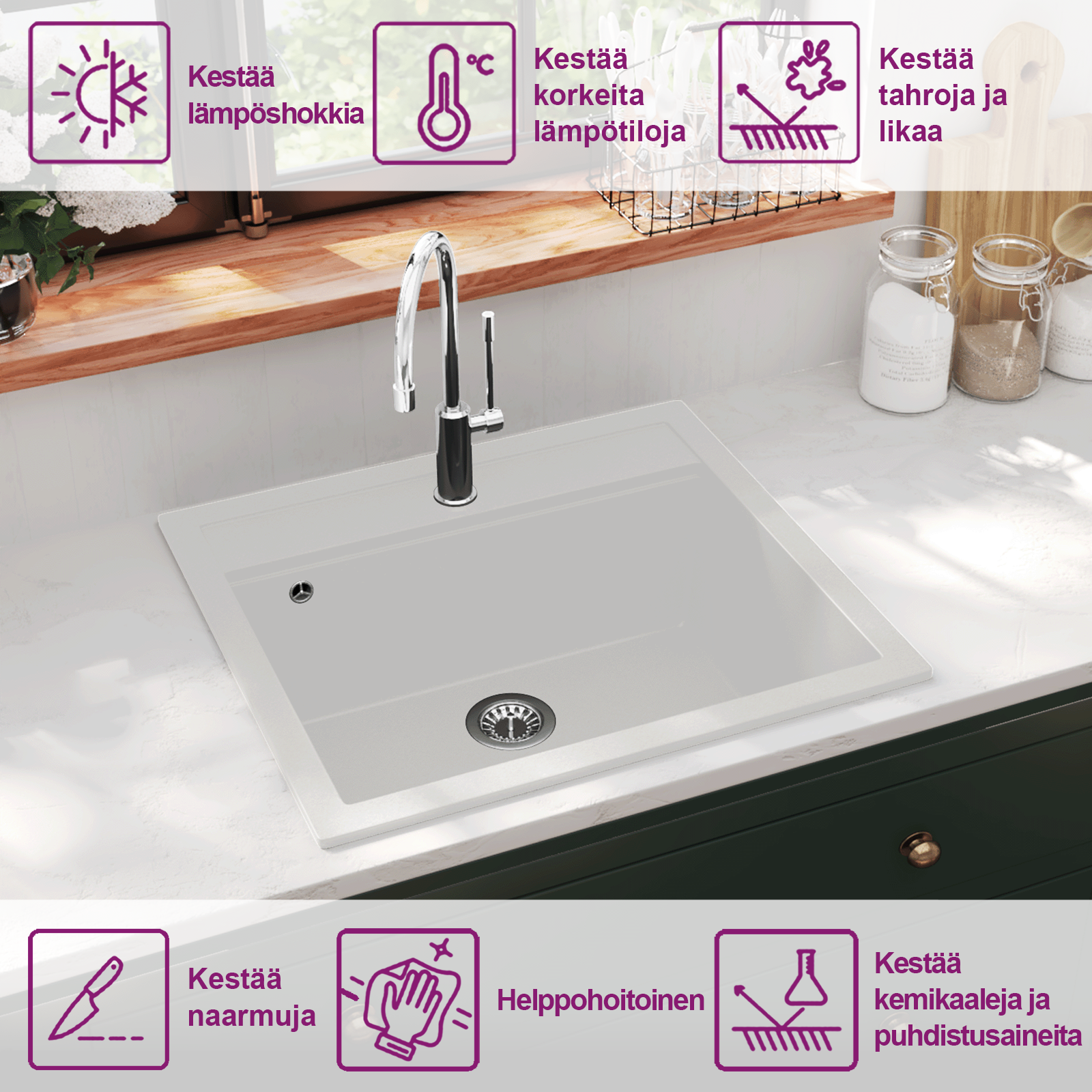 Laadukas graniittinen tiskiallas kestää kuumuutta ja iskuja, ei naarmuunnu ja on vaivaton puhdistaa. Mukana tulee myös siivilä, jonka ansiosta roskat on helppo poistaa.