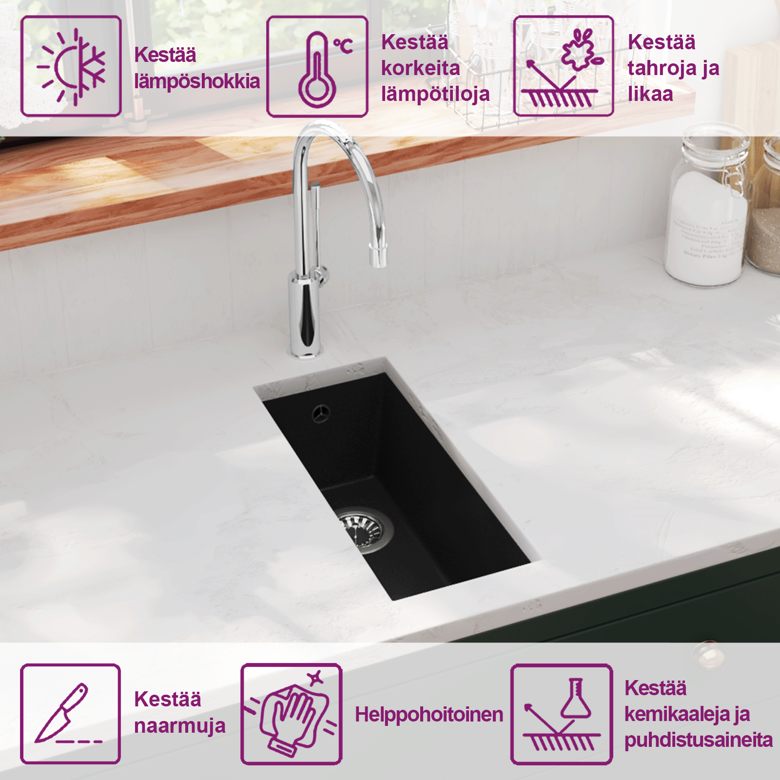 Tämä graniittinen tiskiallas on ajaton lisä keittiösi sisustukseen. Siinä on yksi, erityisen syvä allas ja tyylikäs muotoilu.