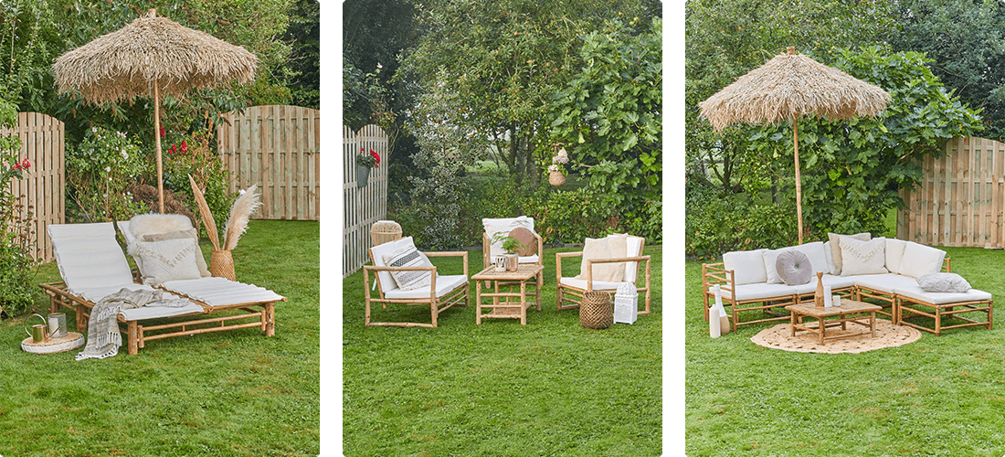 Puutarhasi trooppinen tunnelma ei ole täydellinen ilman useita kasveja – joten miksi et valitsisi bambu puutarhavuodetta säleiköllä? Voit myös erotella lepoalueesi bambuaidalla. Se luo kodikkaan ja houkuttelevan tilan. Koristele bambu puutarhakalusteesi luonnollisen tai eloisan värisillä vilteillä ja tyynyillä, tämä takaa boheemisen tunnelman.