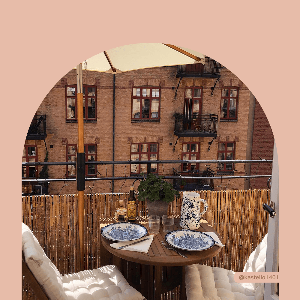 Hyödyllinen vihje: Jos sinua on siunattu parvekkeella, niin haluat ottaa kaiken irti ulkona vietetystä ajasta, säästä riippumatta. Suojataksesi itseäsi vaarallisilta UV-säteiltä ja yksityisyyden takaamiseksi, me suosittelemme seinäkiinnitettävän aurinkovarjon tai parvekkeen suojan asennusta. Tämän lisäksi pehmeä ja mukavat viltit pitävät sinut lämpimänä viileinä iltoina, eikä sinun tarvitse mennä sisälle, joten haluat ehkä lisätä myös nämä parvekkeesi sisustuslistalle.