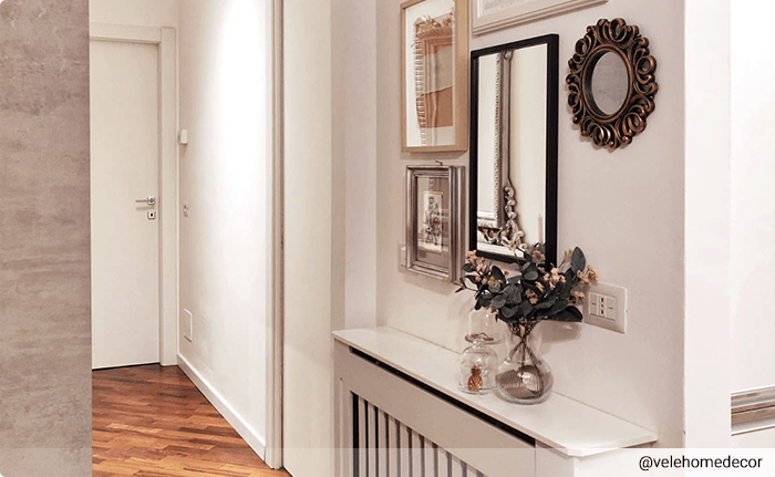 Peilillä eteisessä on tuplatarkoitus. Tarvitset sitä, tästä ei ole epäilystäkään. Jos sinulla on pienempi tila, niin peili saa sen näyttämään kirkkaammalta ja tilavammalta. Valoa heijastava peili luo illuusion tilavammasta eteisestä. Leiki eri muotojen ja kehysten kanssa, tämä korostaa sen koristeellista tarkoitusta.