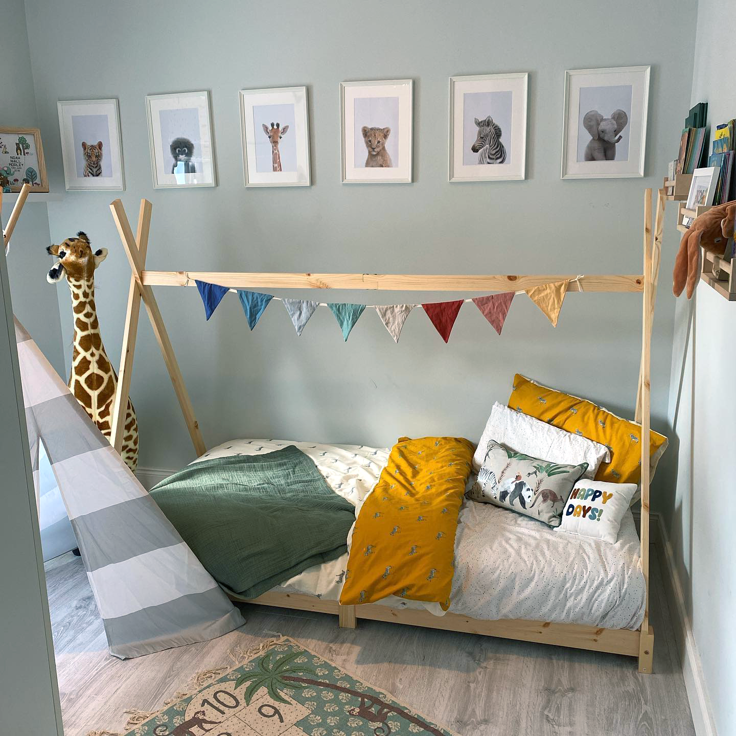 Mainitsimmeko, että mahdollisuudet fantastisen lastenhuoneen seinätaiteen luomiseksi ovat rajattomat? Esimerkiksi voidaan ottaa nuo suloiset ja kekseliäät kollaasit. Hanki kehyksiä ja ripusta seinälle kaikki, mistä lapsesi pitää, henkilökohtaisista kuvista luontokuviin ja suosikkihahmoihin. Voit myös ripustaa macramé seinävaatteita tai muita tee-se-itse koristeita, joita sinä ja lapsesi voitte työstää yhdessä, tällä tavalla voitte antaa lastenhuoneen seinätaiteelle lämpimämmän tunnelman.